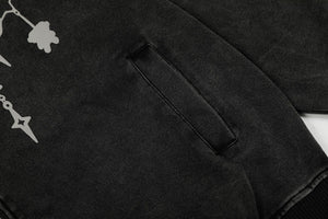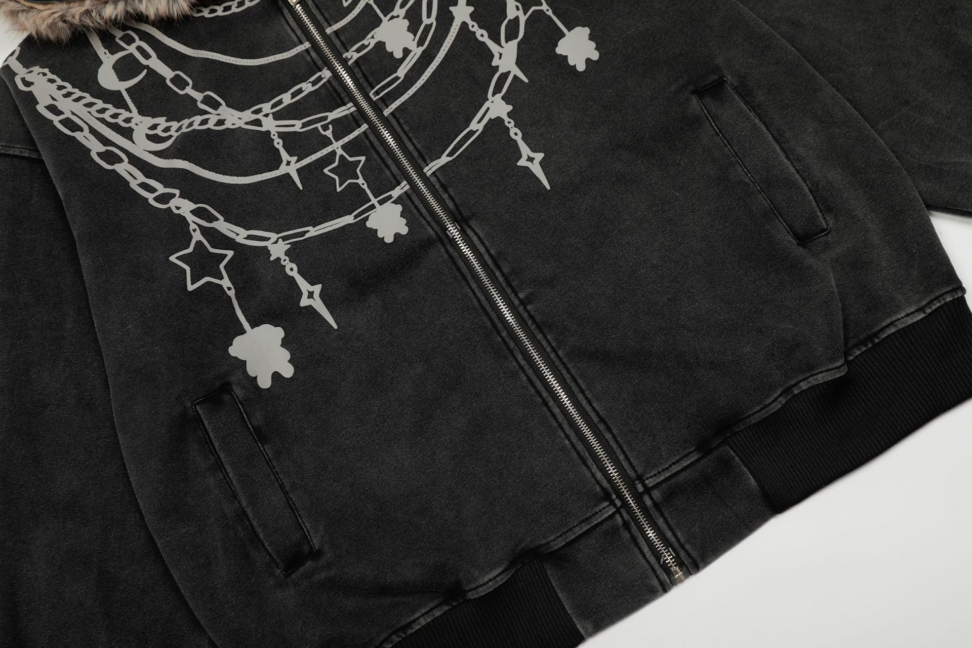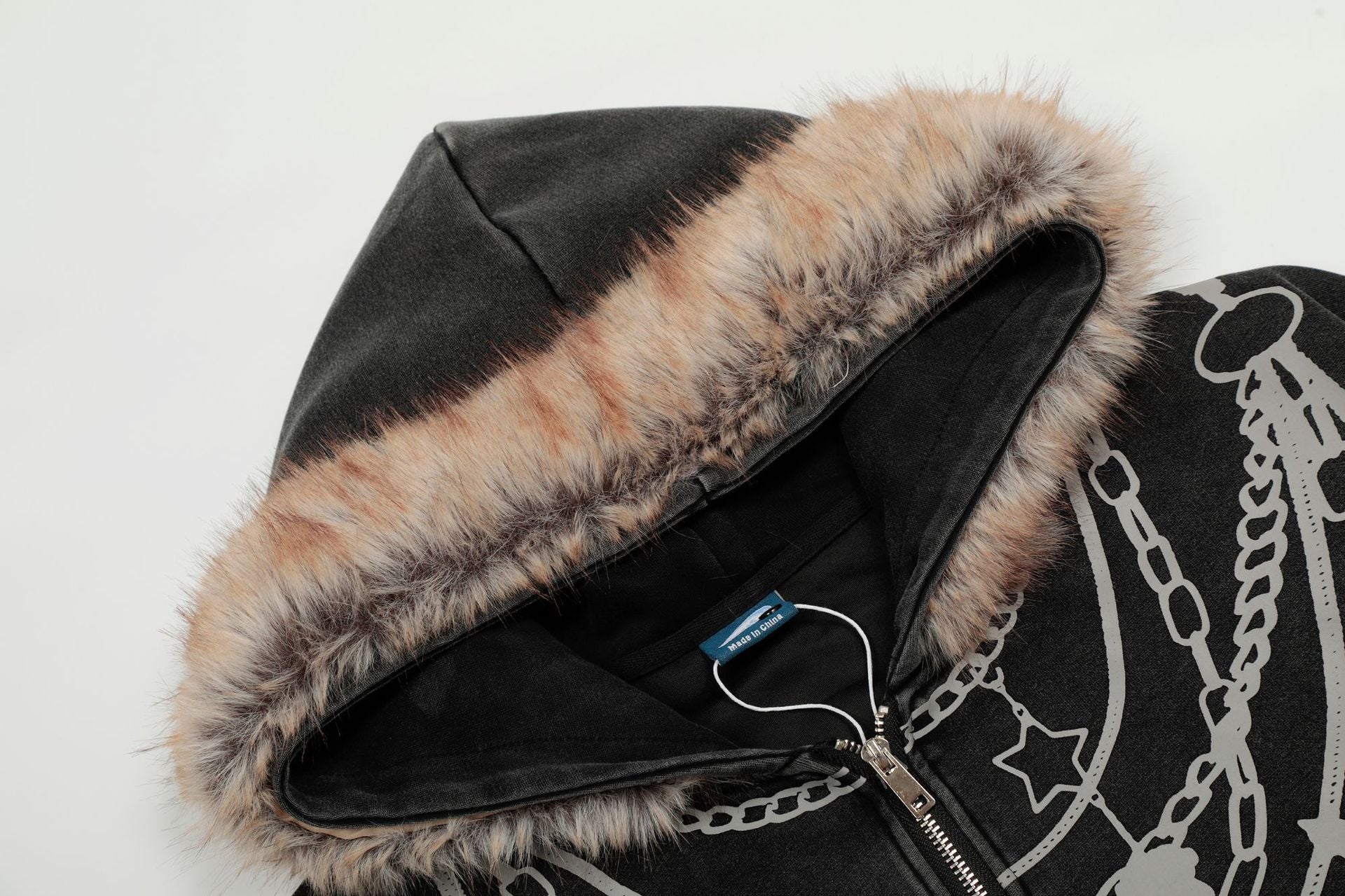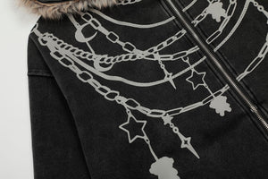 Zwoyren Chain Print Fur Collar Zip Up Hoodie