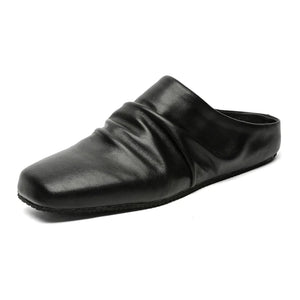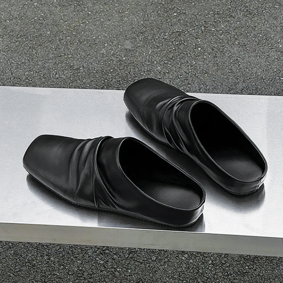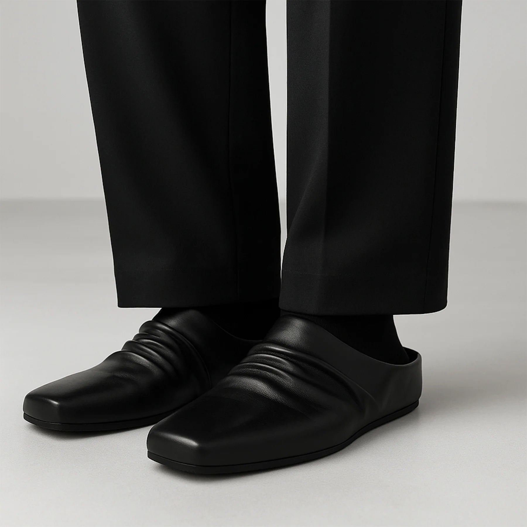 These leather slip-ons are a sleek choice for relaxed tailoring or easy off-duty moments. The soft pleats and minimal shape bring a quiet confidence to every step.