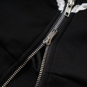 This cropped zip-up hoodie features charming ruffle trim and delicate rivet details that add a cute and playful touch. Made with soft fabric for cozy comfort, it’s perfect for creating an adorable, casual look with a hint of unique style.
