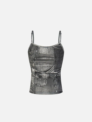 A bold fusion of Y2K nostalgia and trompe-l'œil design, this fitted cami features a hyper-realistic denim print for a striking streetwear aesthetic. Sleek spaghetti straps add an effortless edge, making it perfect for layering or wearing solo.