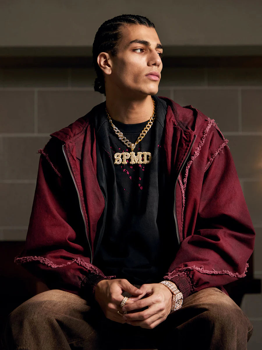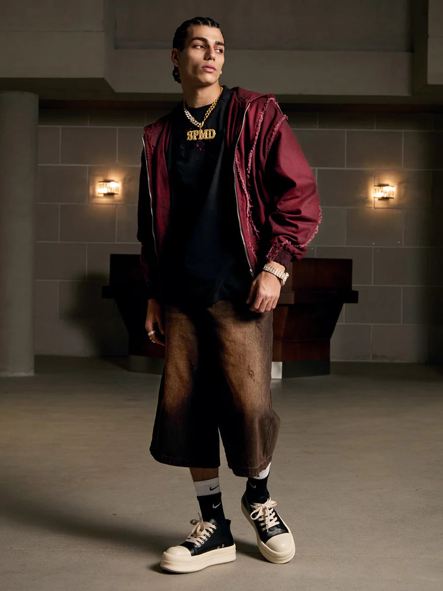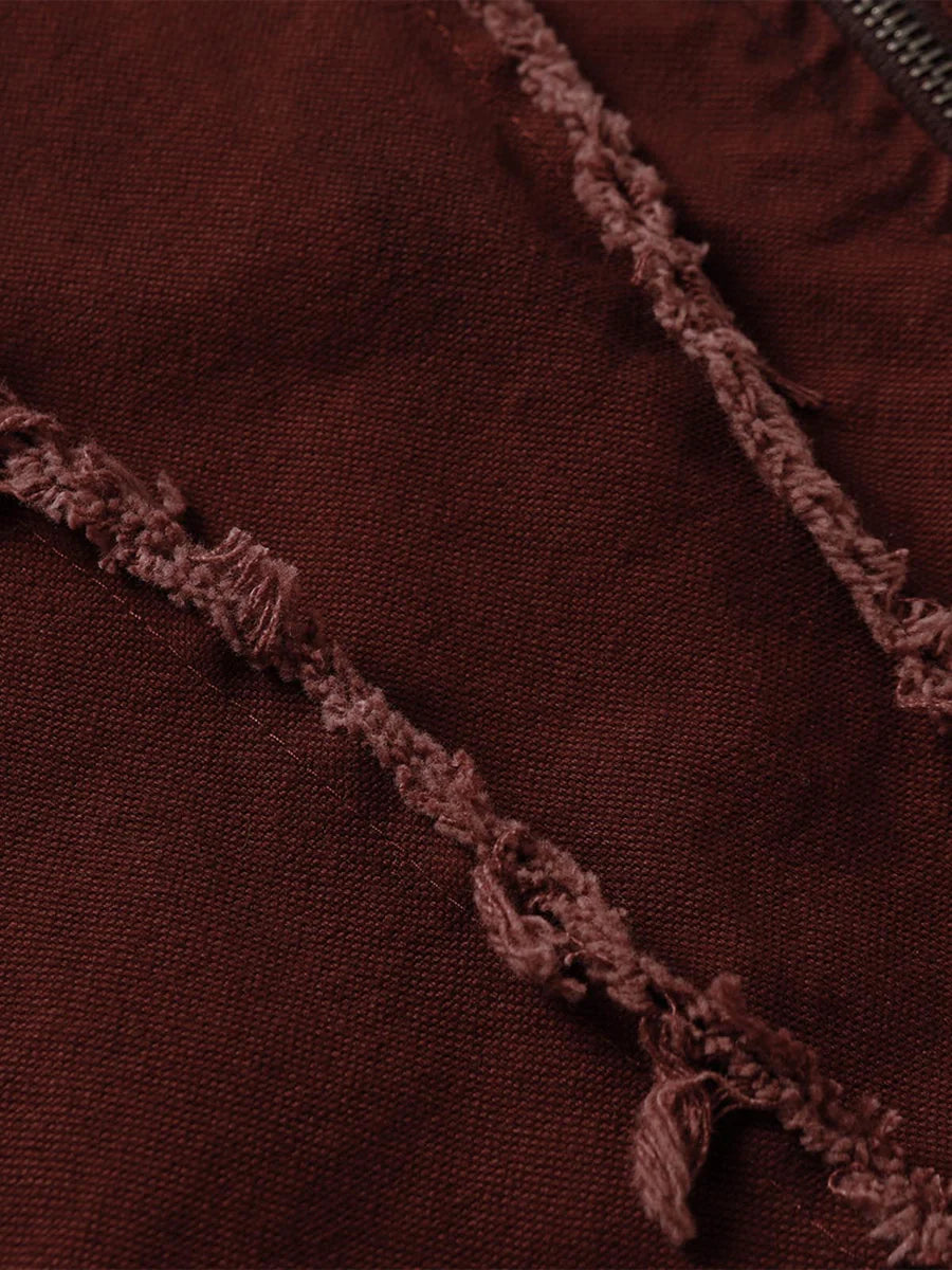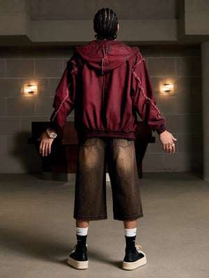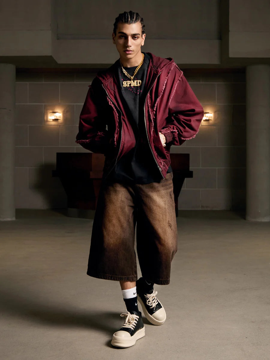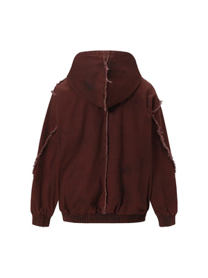 •    Design Elements: Frayed Edges, Front Zipper Closure, Hooded Neckline
