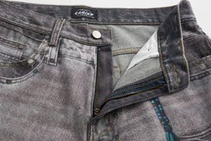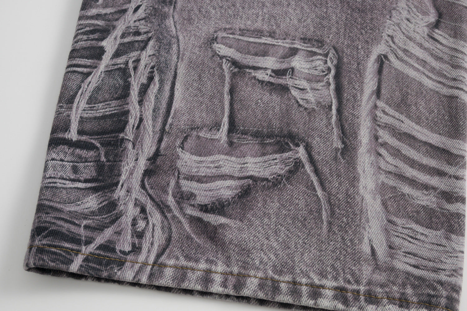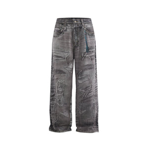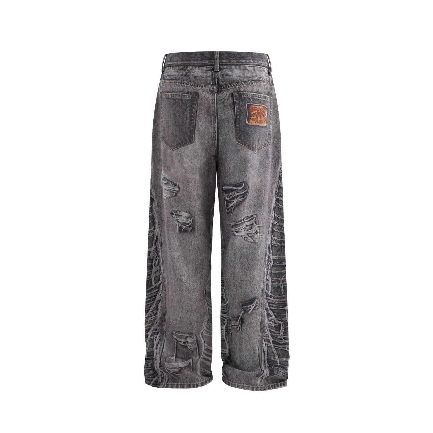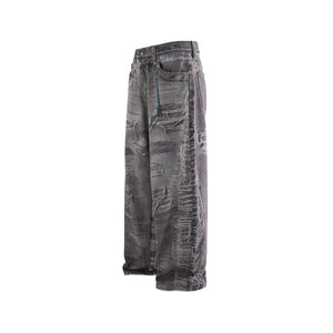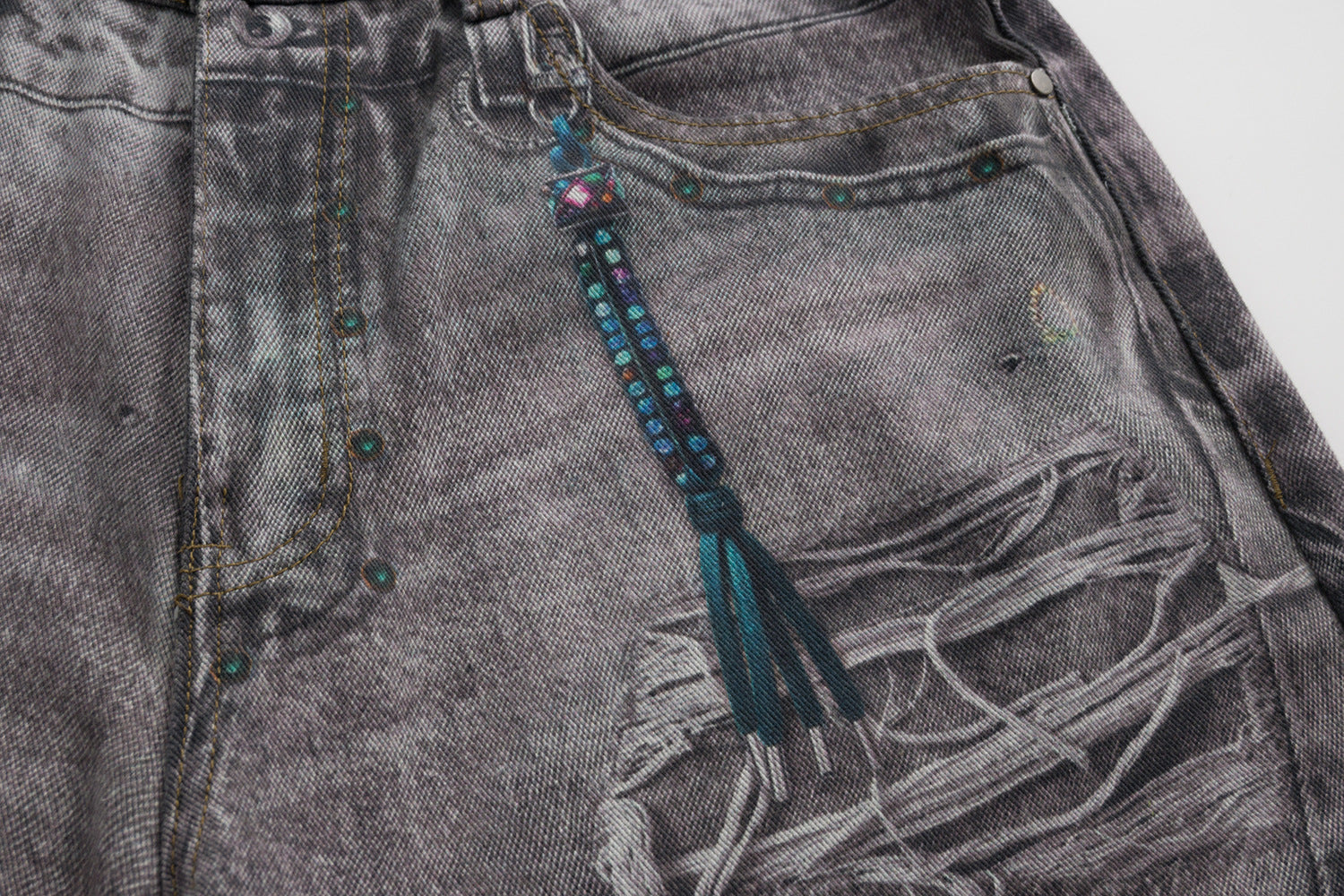 These jeans feature all-over printed graphics layered with heavy distressing and raw-edge tassel fringe detailing, giving them a rugged, deconstructed look. The midweight denim offers a structured yet comfortable fit, while the loose-leg silhouette enhances the laid-back vibe.