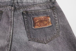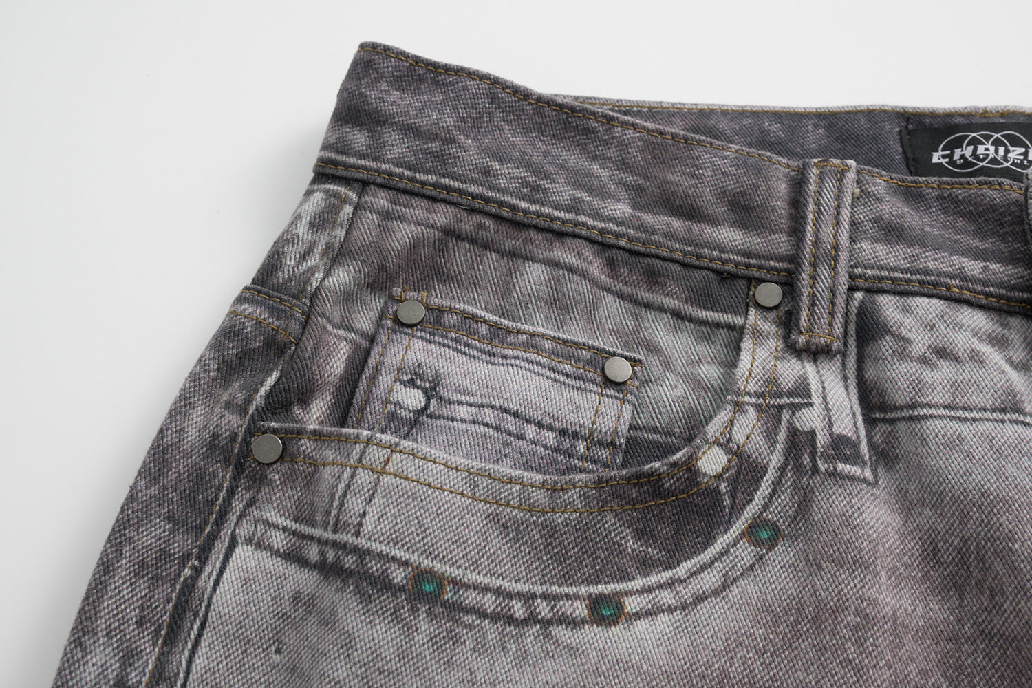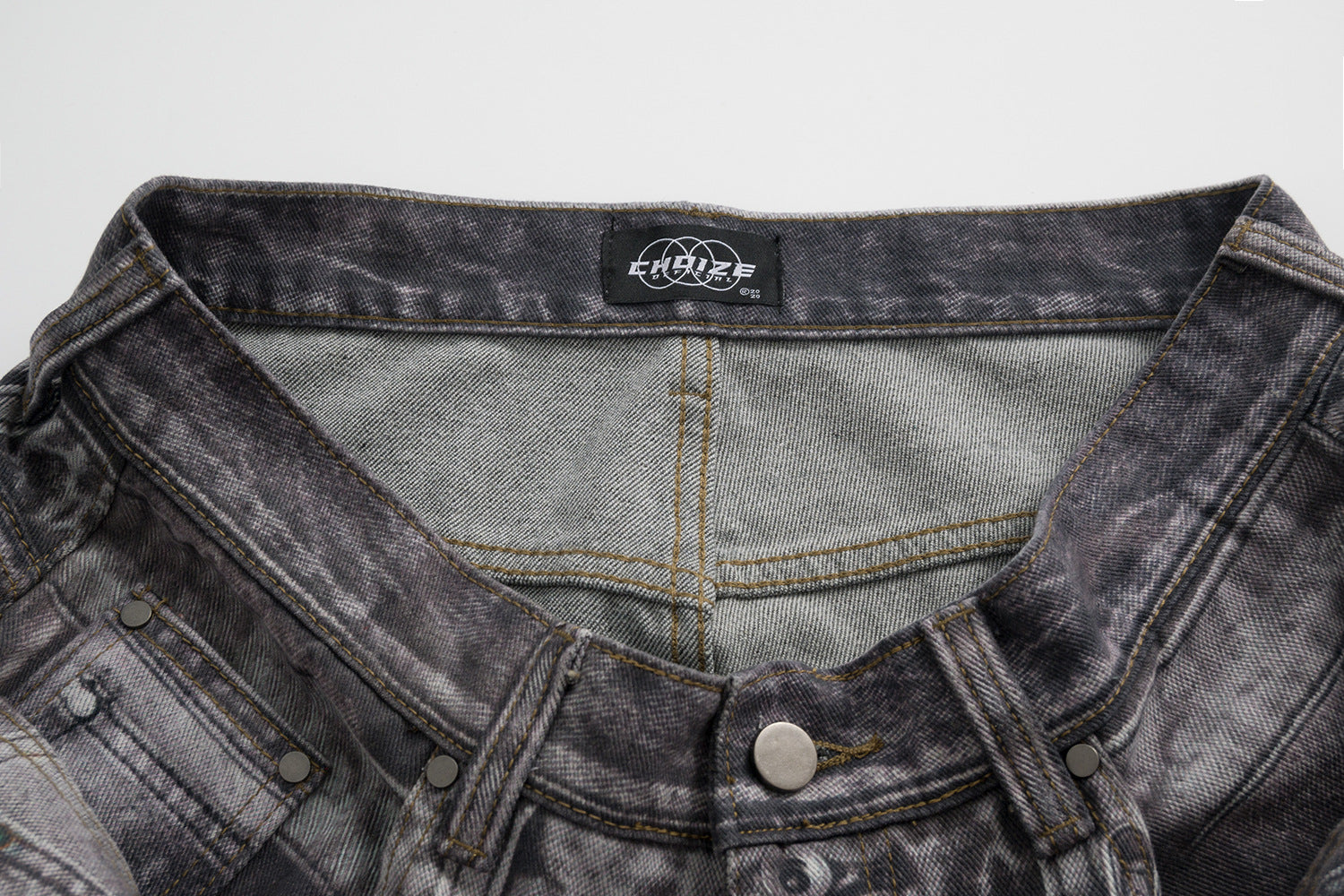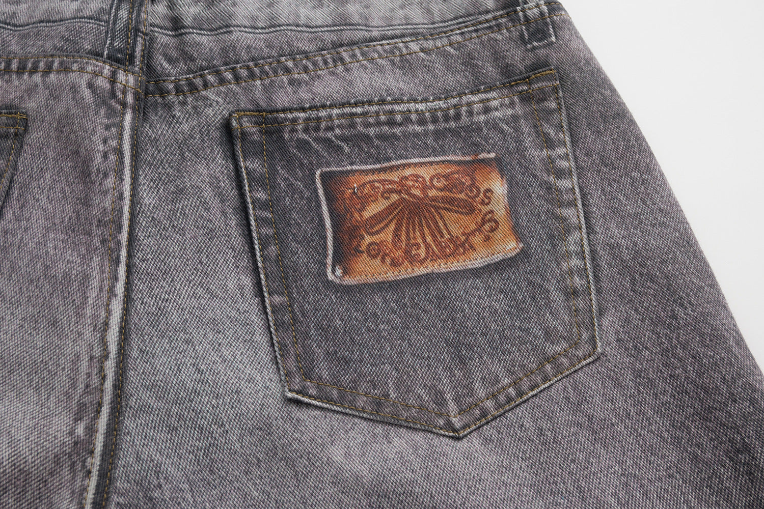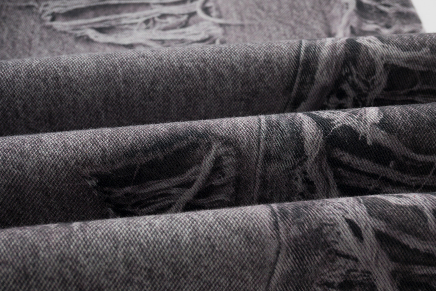 These jeans feature all-over printed graphics layered with heavy distressing and raw-edge tassel fringe detailing, giving them a rugged, deconstructed look. The midweight denim offers a structured yet comfortable fit, while the loose-leg silhouette enhances the laid-back vibe.