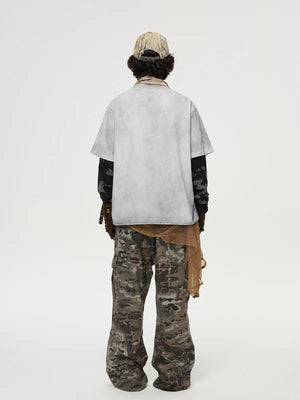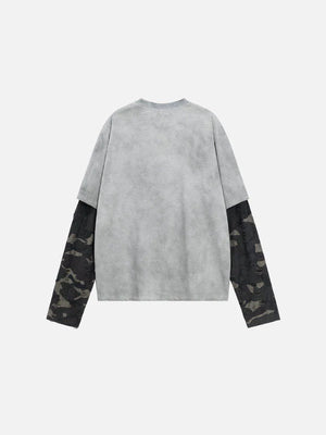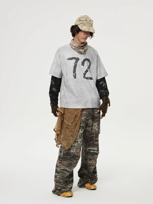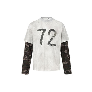 This Camouflage Distressed Long Sleeve Tee combines a worn-in short sleeve with camouflage long sleeves. A large, prominent number graphic on the chest completes the look, adding a distinctive touch to casual wear.