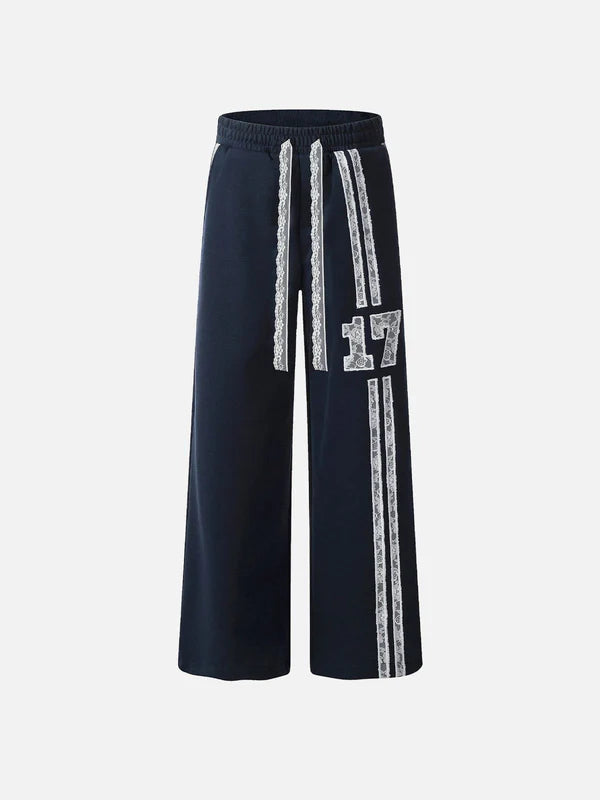 These sweatpants blend sporty comfort with delicate details. Featuring lace-trimmed side stripes and a bold "17" patch, they add a unique twist to casual wear. The wide-leg silhouette and adjustable drawstring waist ensure a relaxed fit, perfect for lounging or pairing with sneakers for an elevated streetwear vibe.