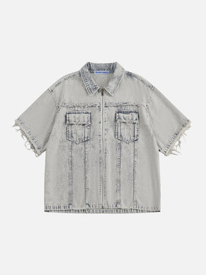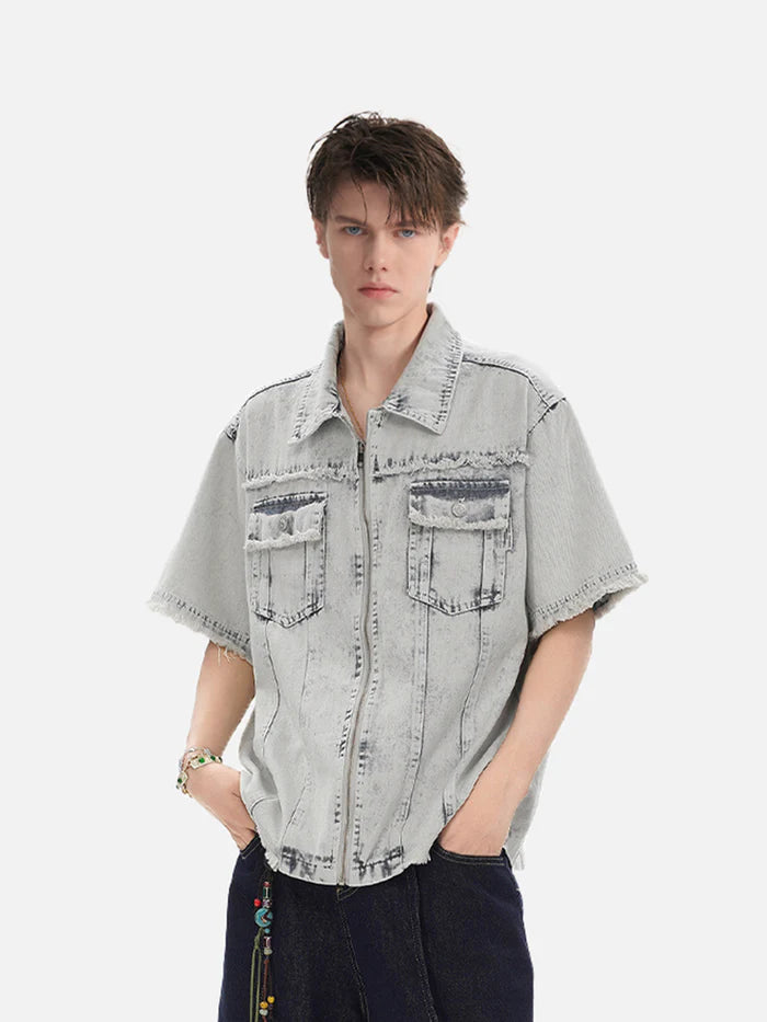 Zwoyren Fringe Washed Denim Short Sleeve Shirt