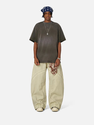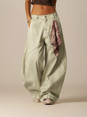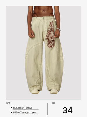 These baggy-fit jeans feature a unique curved cut and a waistband-inspired hem detail at the cuffs, blending structure with creativity. The innovative design brings a fresh, fashion-forward twist to a classic silhouette. Paired with a red checkered Kerchief, it creates a striking look that’s anything but ordinary.
