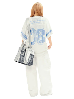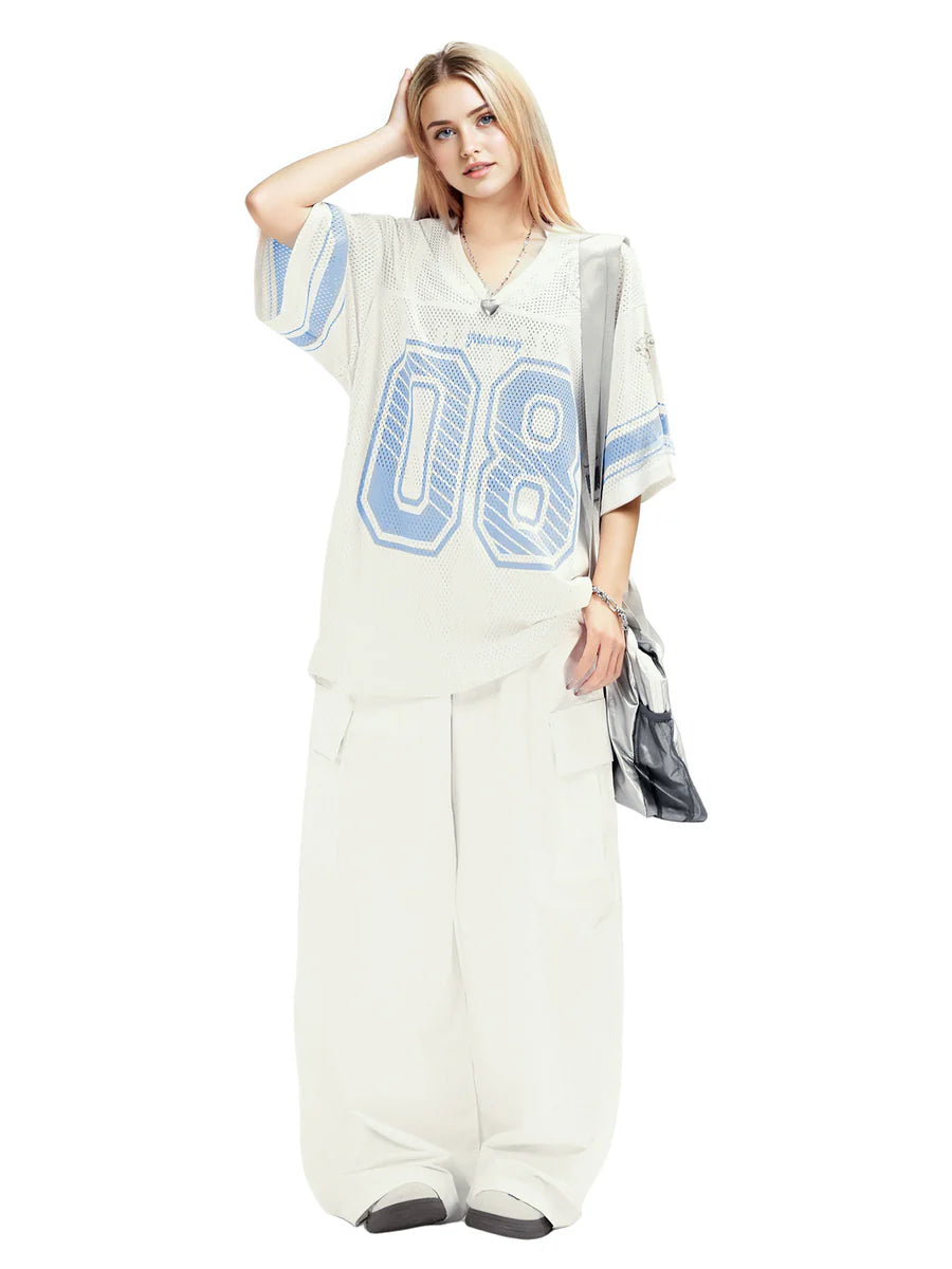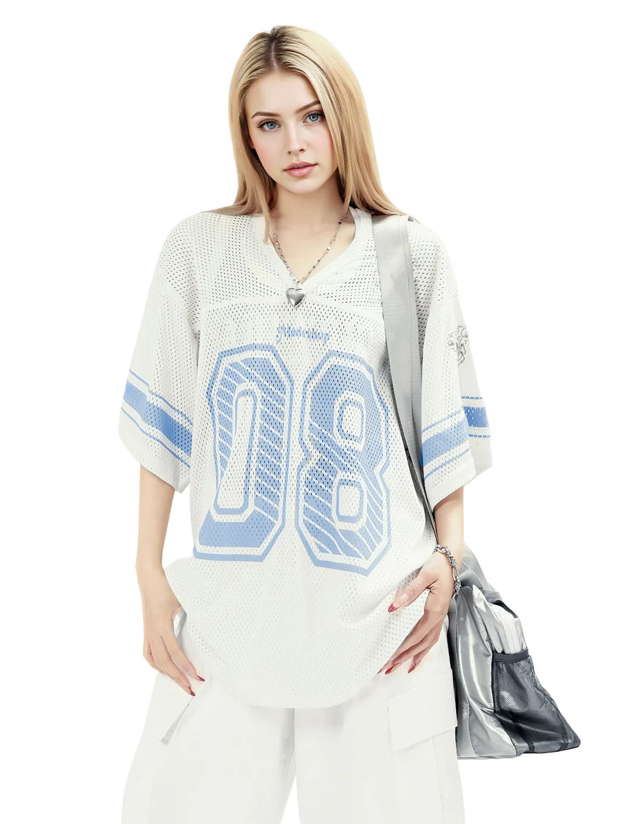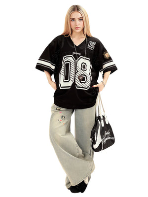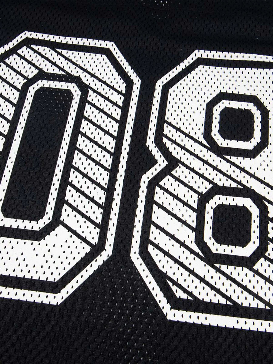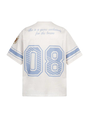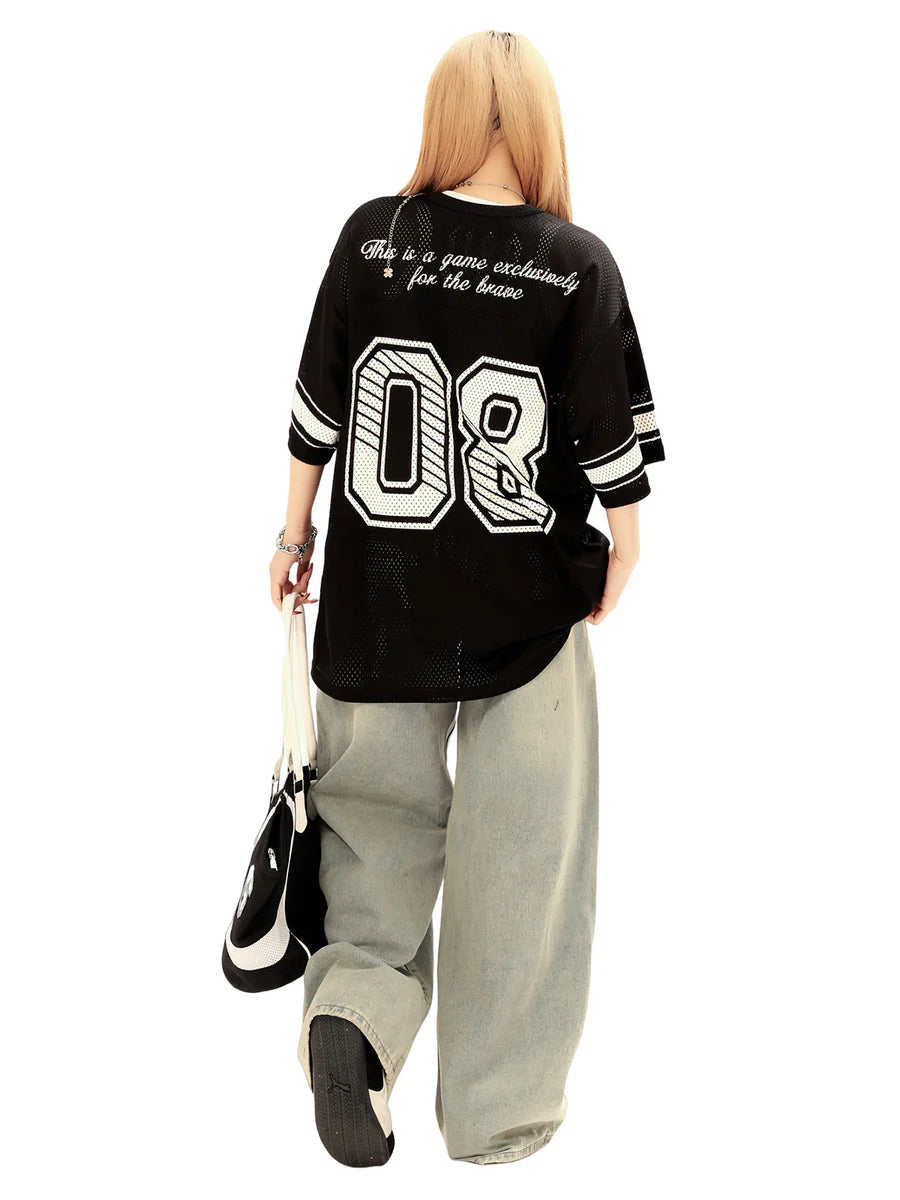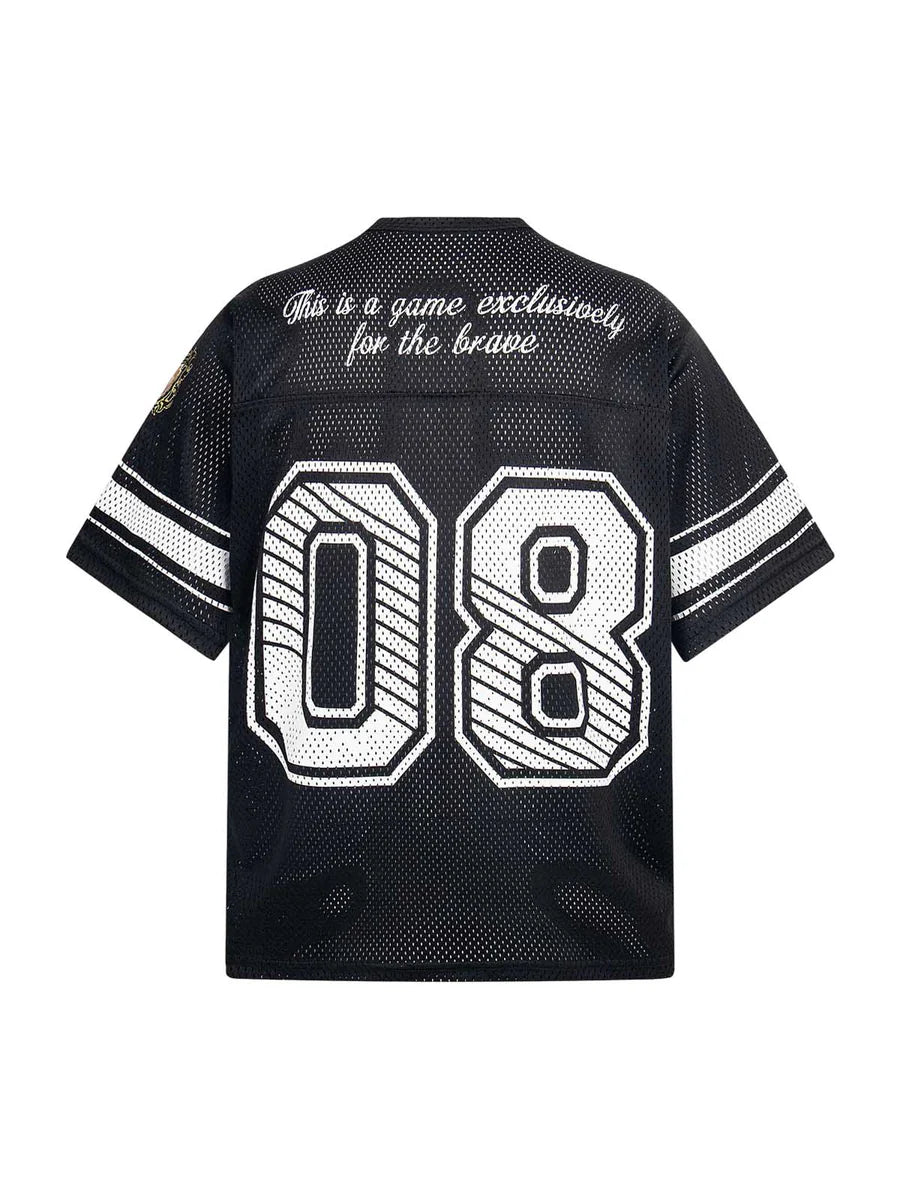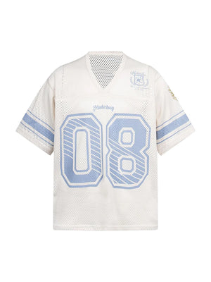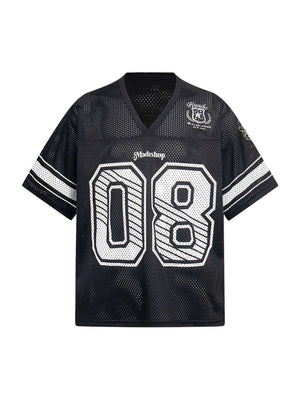 • Design Elements: Large "08" number print, striped sleeves, and embroidered logo details