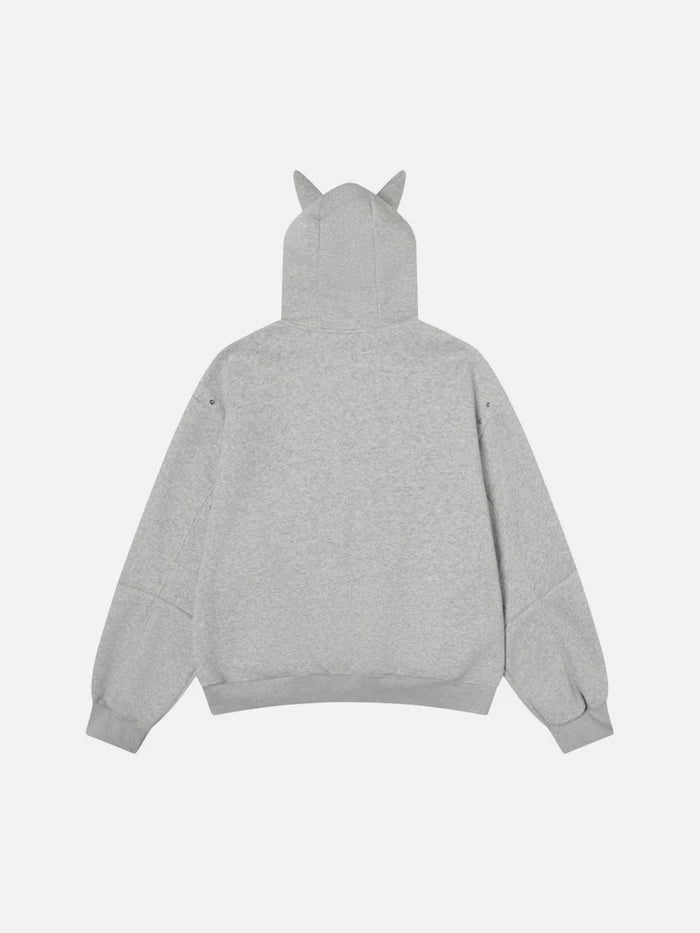 This isn’t just a hoodie — it’s a statement. Designed with bold rivet “horn” ears on the hood, this oversized zip-up fuses punk edge with playful rebellion. Built for those who wear attitude as their style.