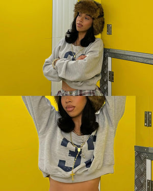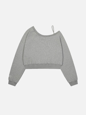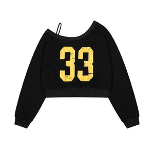 This cropped sweatshirt combines a sporty vibe with a modern twist, featuring a bold "33" print on the front. The irregular shoulder design adds a playful, offbeat touch, perfect for casual streetwear looks. Soft, comfortable fabric ensures both style and ease for everyday wear.