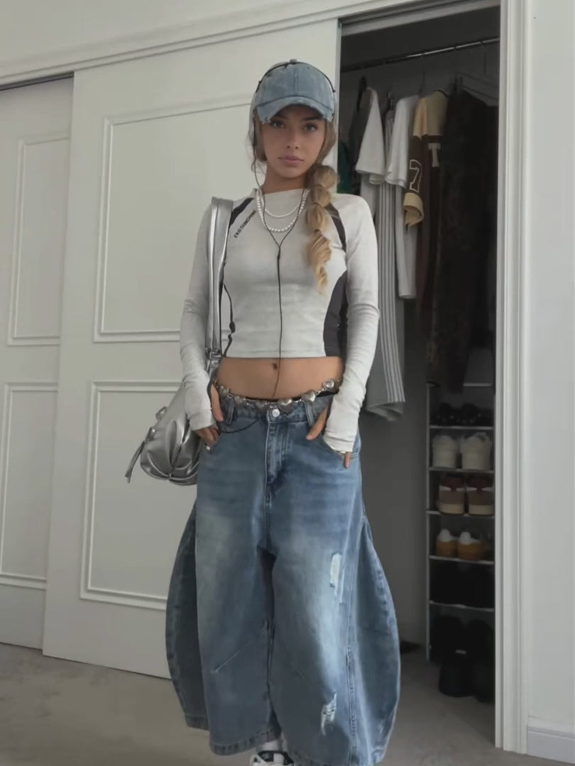 These washed jorts bring a vintage edge with exaggerated barrel-shaped legs and distressed detailing throughout. The longline cut hits that perfect sweet spot between laid-back and standout.