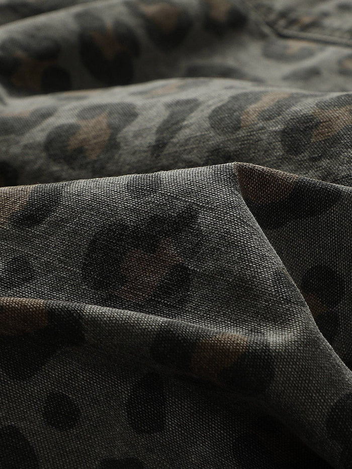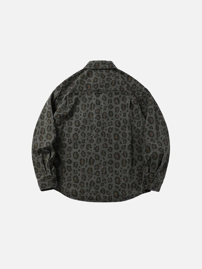 The Leopard Print Long Sleeve Shirt features a subtle grey-toned leopard pattern, offering a low-key yet distinctive style. Its muted palette and relaxed fit create a unique balance of understated elegance and modern edge, perfect for versatile styling.