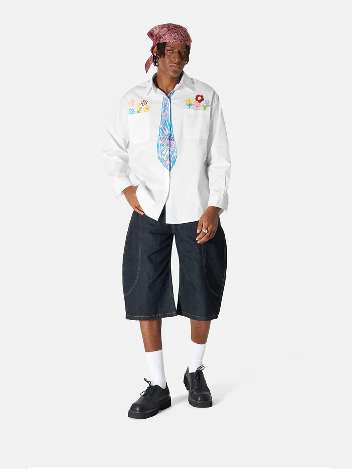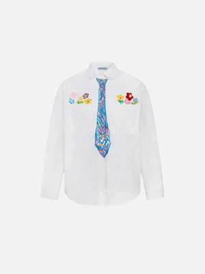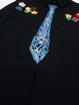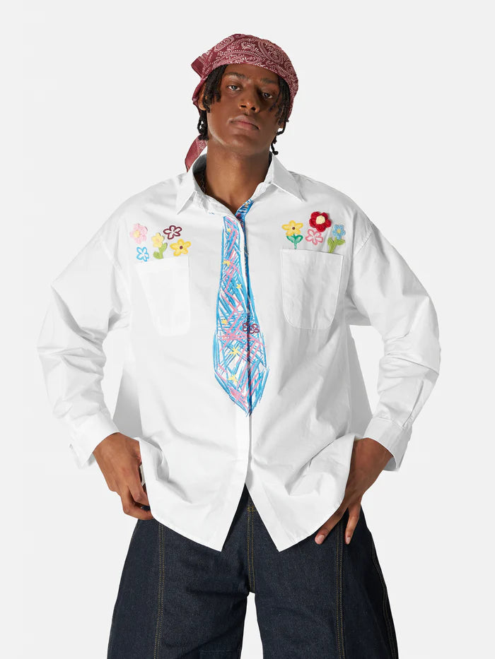 Add a pop of joy to your wardrobe with our vibrant long-sleeve shirt! Featuring a playful faux tie and handcrafted floral details, it's a statement piece that turns heads. The rich, bold colors bring energy and excitement to every moment. Wear happiness, wear confidence!