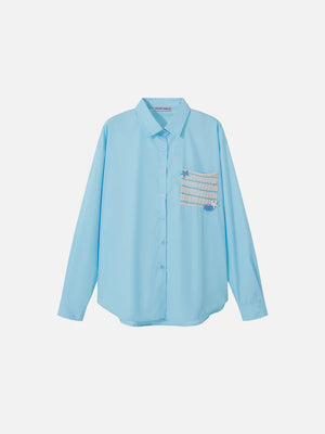 Keep it clean yet unique with this sky blue long-sleeved shirt. The striped pocket and delicate starfish charm add just the right amount of personality. A versatile staple for layering or wearing solo.