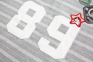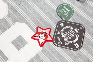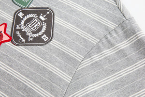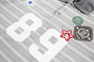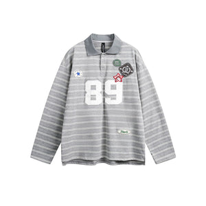 This long sleeve polo brings the heat with bold patches, a striped backdrop, and that classic collar energy. Whether you're on campus or curbside, this piece makes a statement without even trying.