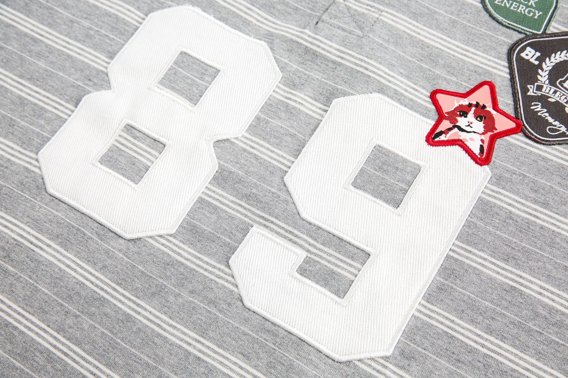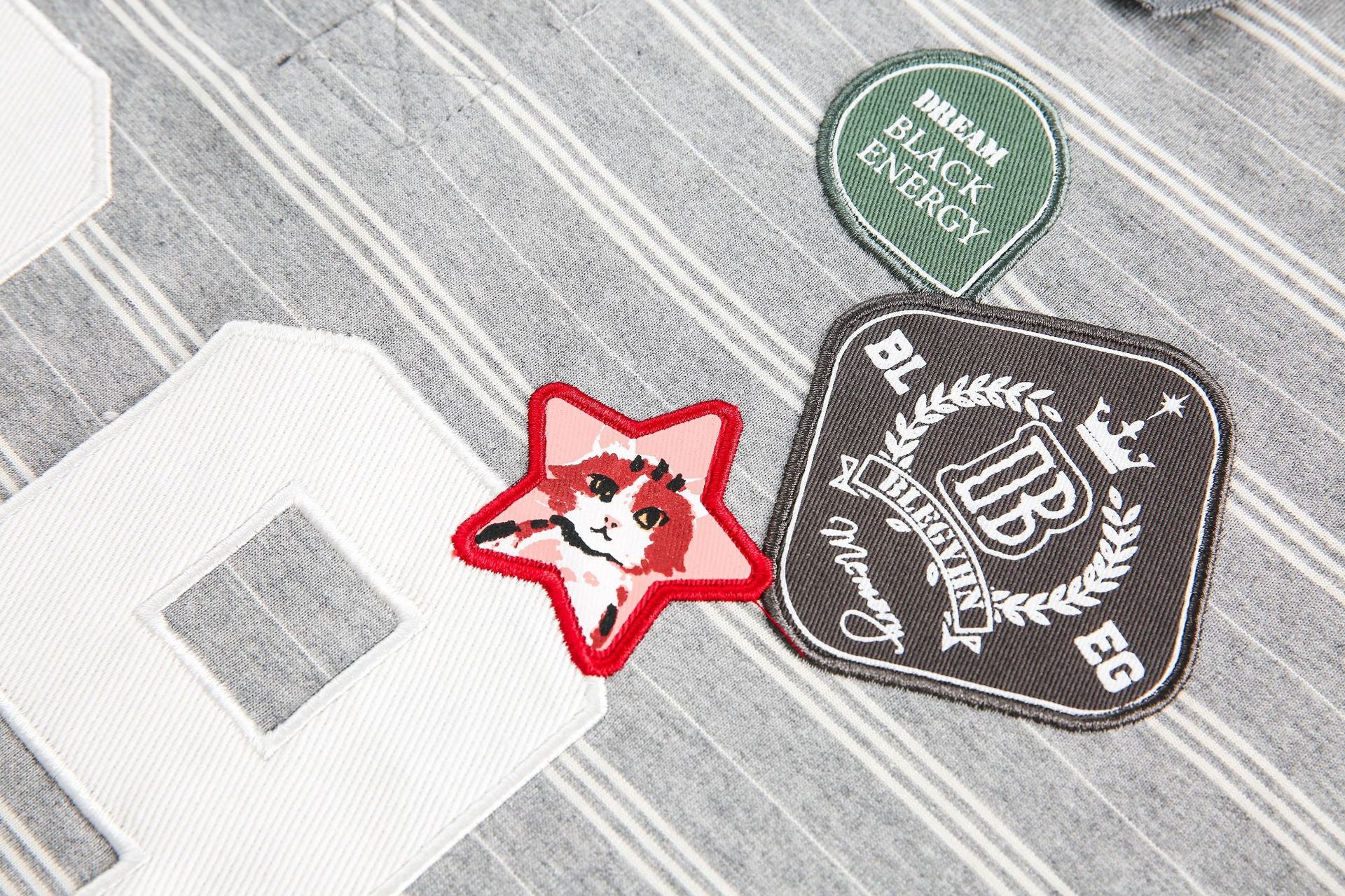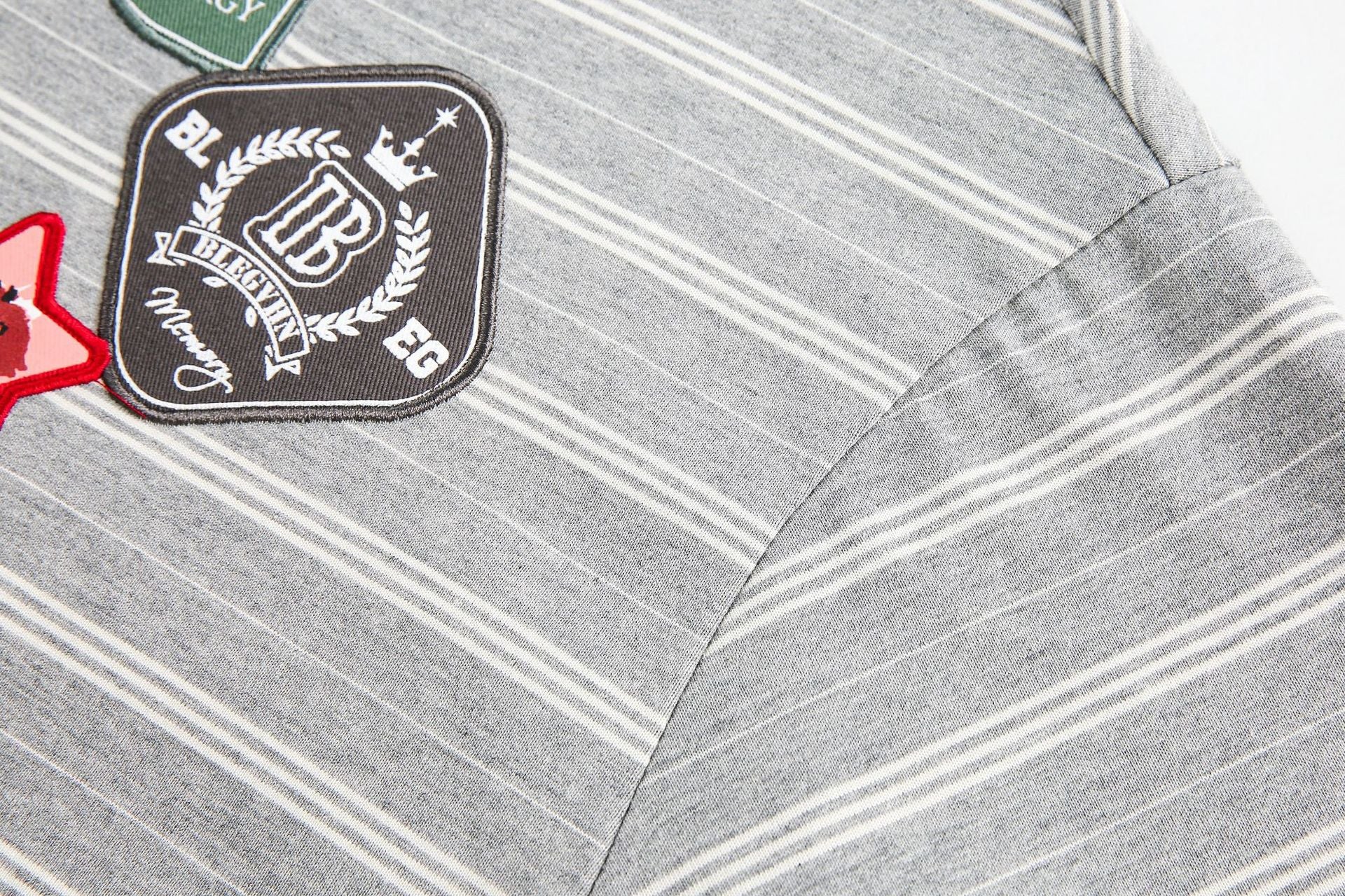 Clothing details: Badge, Stripe.