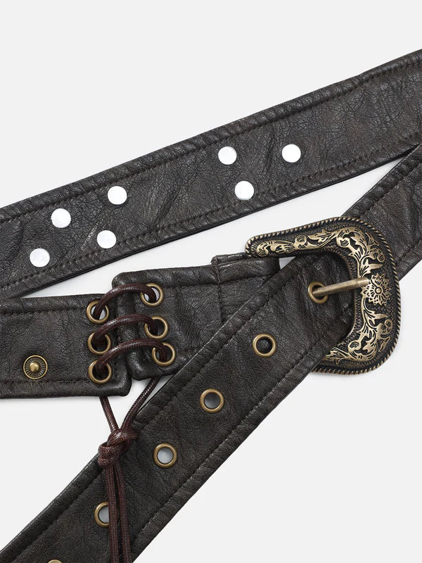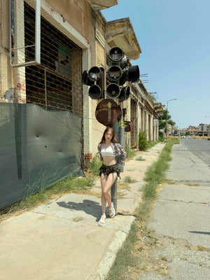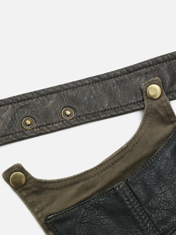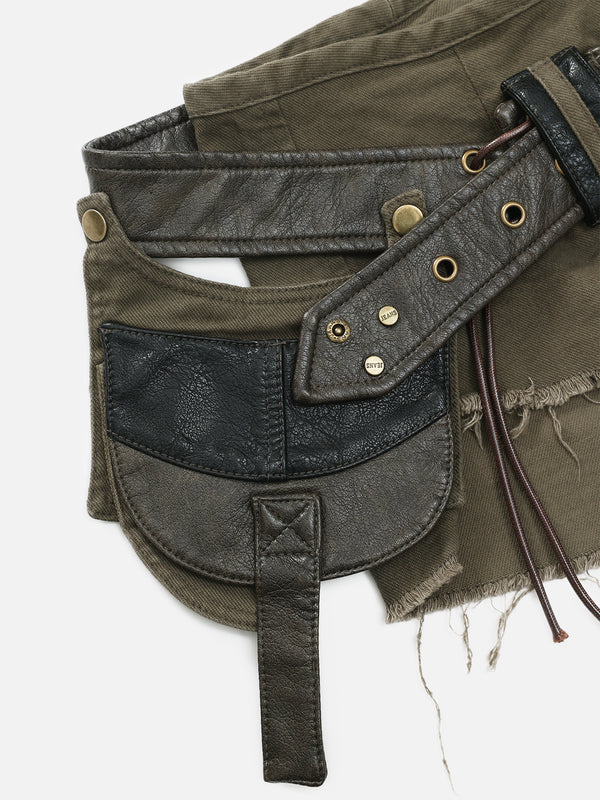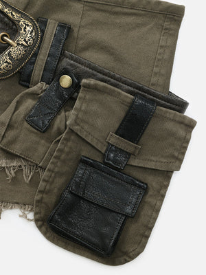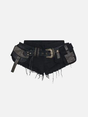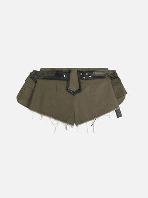 Designed with a rugged, utilitarian aesthetic, these shorts feature a distressed hem, multi-pocket detailing, and an adjustable waistband with vintage buckle trim. The combination of cotton and leather elements creates a bold, tactical-inspired look that's perfect for making a statement.