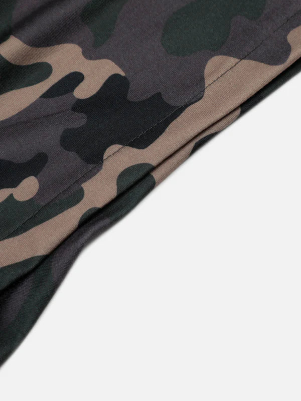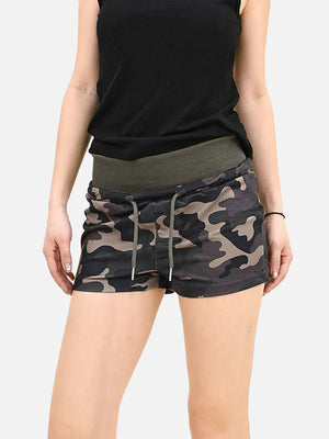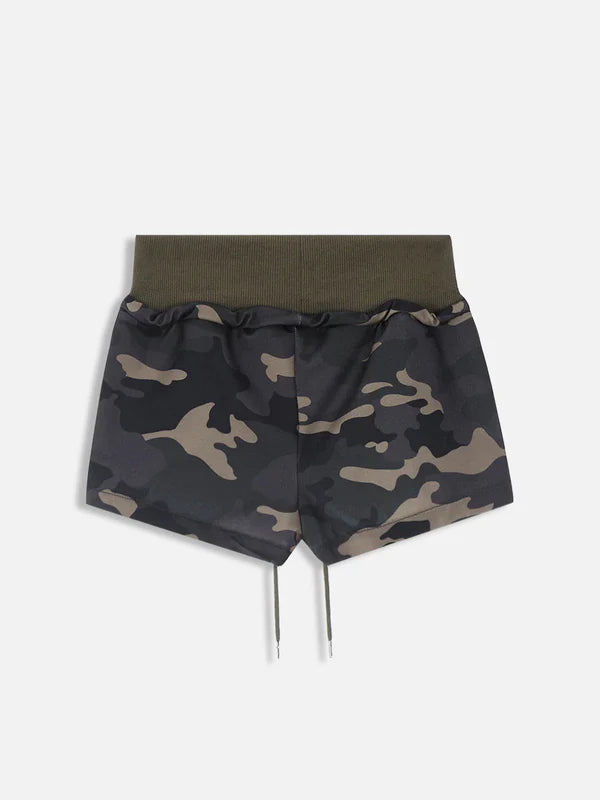 These mini shorts feature a bold camouflage print with a ribbed high-waist design for a secure fit. The drawstring detail enhances adjustability, while the curved hem adds a sporty edge.