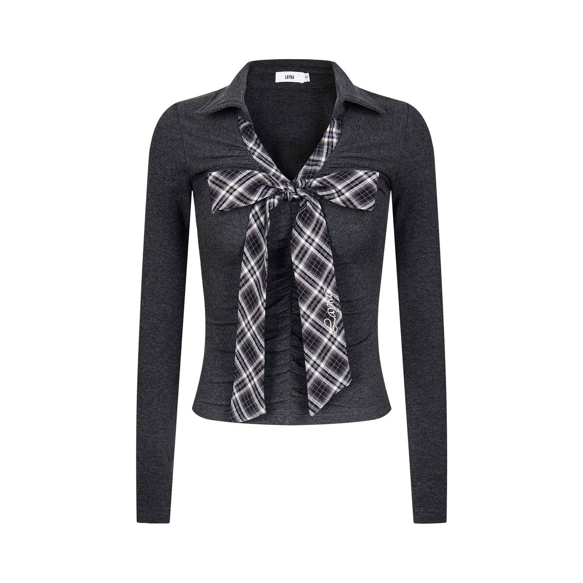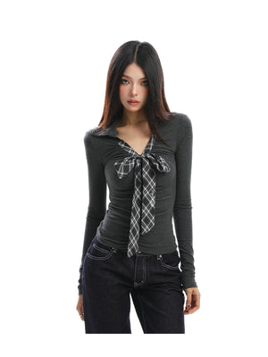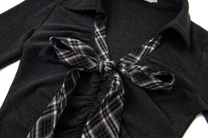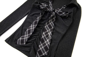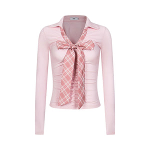 Zwoyren Long Sleeve Plaid Bow Tie Top