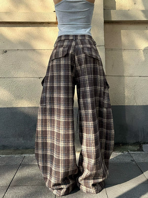 Zwoyren Vintage Plaid Pleated Cargo Casual Pants