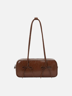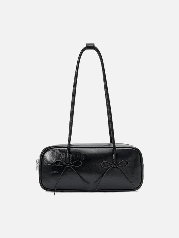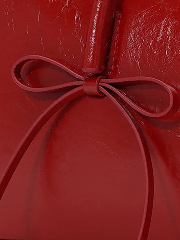 This sleek faux leather bag is the perfect accessory to elevate any outfit. Adorned with a delicate bow detail on the front, it features a structured rectangular shape that combines elegance with modernity.