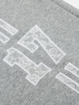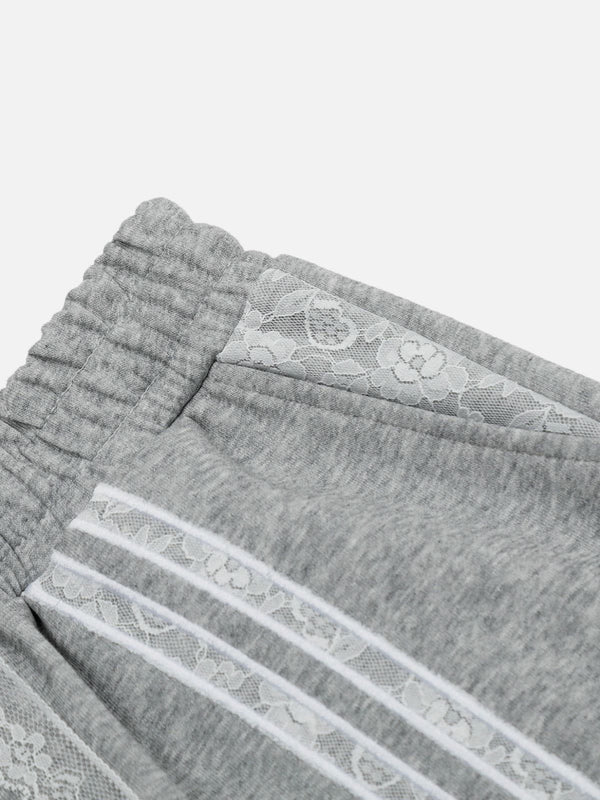 These sweatpants blend sporty comfort with delicate details. Featuring lace-trimmed side stripes and a bold "17" patch, they add a unique twist to casual wear. The wide-leg silhouette and adjustable drawstring waist ensure a relaxed fit, perfect for lounging or pairing with sneakers for an elevated streetwear vibe.