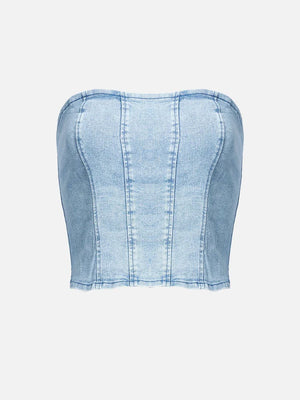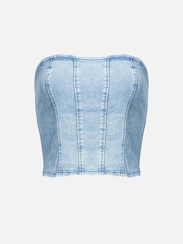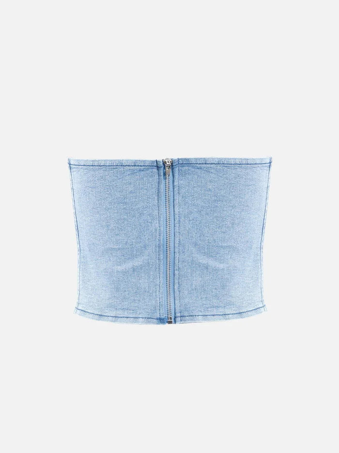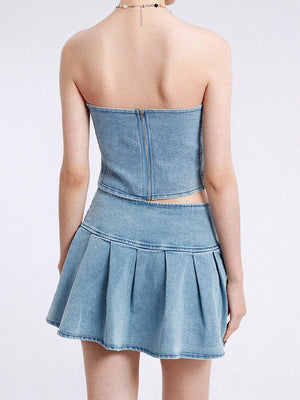Unleash a blend of sexy, sweet, and cool styles with this two-piece denim tube top and skirt suit. Perfect for crafting a youthful and edgy look, the backless zipper design and skirt slit effortlessly highlight your figure curves, making a bold statement in fashion.